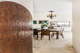 Arched doorways, lead-light feature window, timber slab breakfast bar, rough-hewn doors and an impressive stone fireplace imbues social zones with a warm & welcoming rustic ambience.