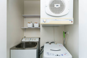 Cupboard laundry with a washing machine and unusually for an apartment, a laundry tub.